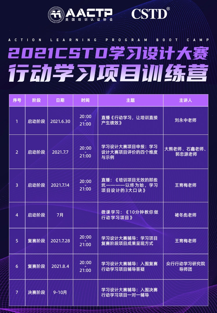 为帮助行动学习参赛项目在材料申报、复赛选拔以及决赛现场能有更好的表现,2021全国学习设计大赛战略开云下载的合作伙伴aactp美国培训认证协会,在主办方cstd邀请下,特别为参赛选手精心设计了《2021cstd学习设计大赛-行动学习项目训练营》,同时也欢迎其他类型的报名企业参加!