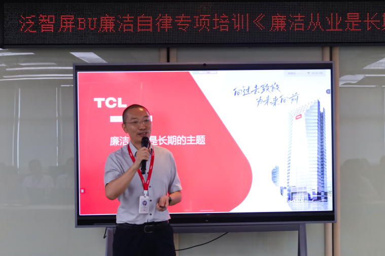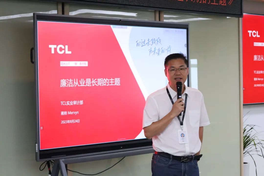 tcl实业泛智屏bu以新时代廉洁文化建设为导向,为捍卫tcl“变革、创新、当责、卓越”核心价值观,引导全员树立正确价值观,进一步提升廉洁从业意识。8月24日,泛智屏bu特别邀请tcl实业审计部反舞弊监察副总监蒋帅到惠州tcl液晶产业园,开展廉洁自律专项活动培训赋能篇第二讲《廉洁从业是长期的主题》。