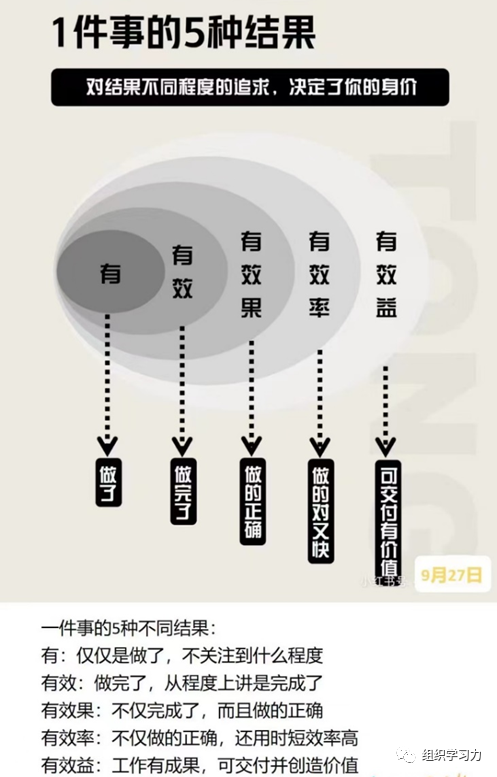 做一件事有5种结果,分别为:做了、做完了、做对了、做的对又快、做得有效益。
