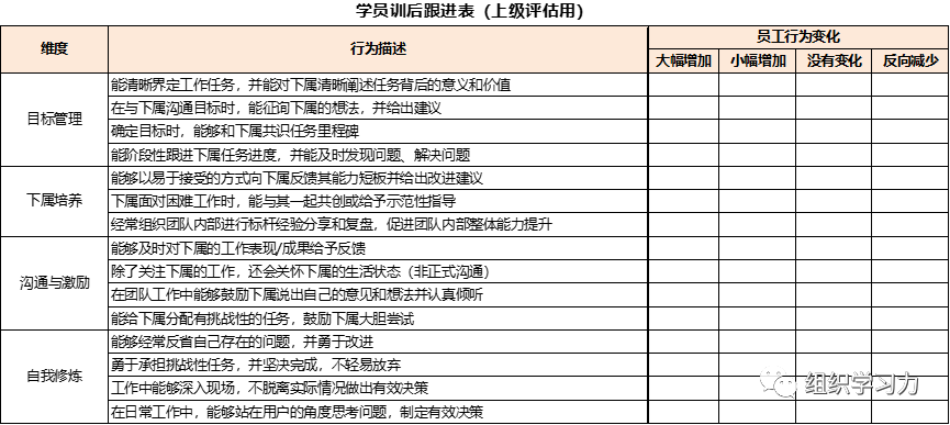 其实最直接的方法是360评估,评估员工行为的改变程度,这种评估一定不能几个月以后再来评估,而是要相对频次高一些的评估,如2周一次。