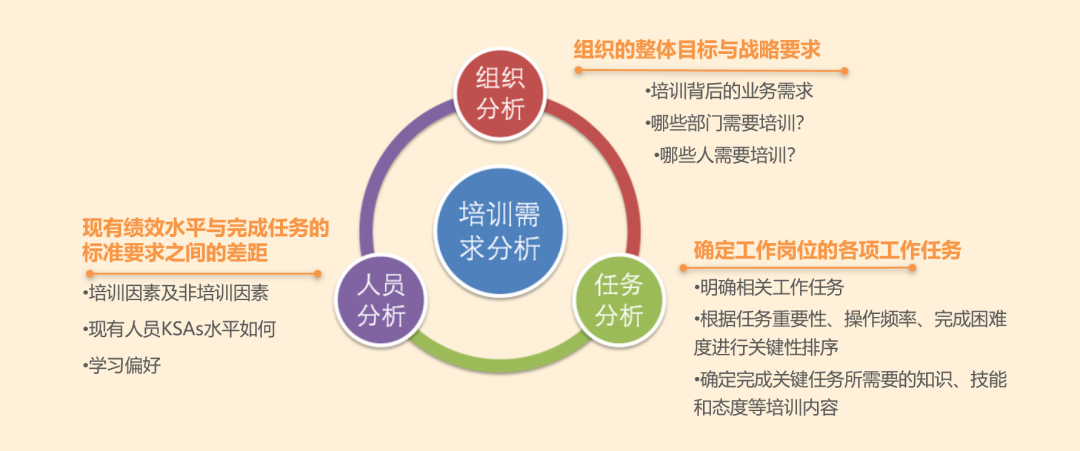 将培训需求分析分为组织分析、任务分析、人员分析三个部分,其分析重心、分析目的、分析方法各有侧重,将使企业的培训计划更有针对性。该模型是一个较为全面的培训需求分析模型,也是目前学术界普遍认同的培训需求分析模型。