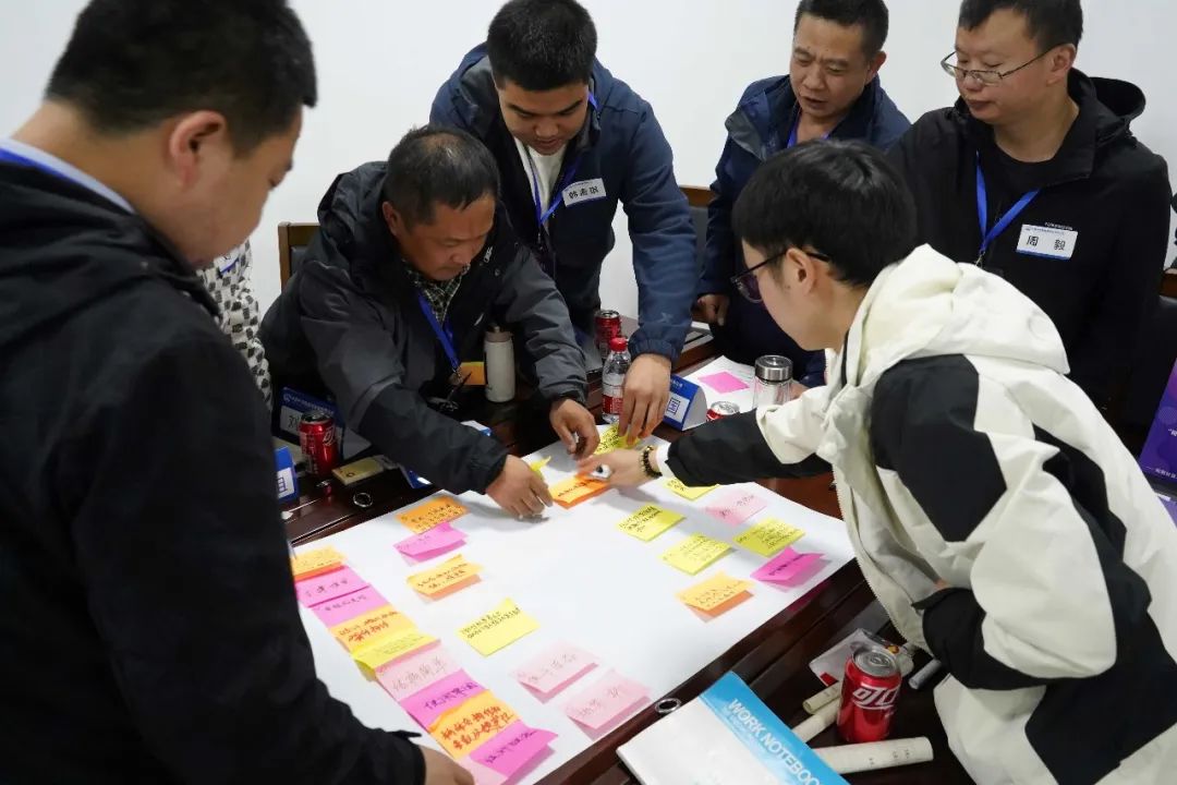 在团队共创环节中,各小组通过主题介绍、头脑风暴、排列组合、提炼中心词、行动模型等关键步骤回顾讨论造桥活动,实现了活学活用,在实践中深化了对于行动学习流程工具的应用。