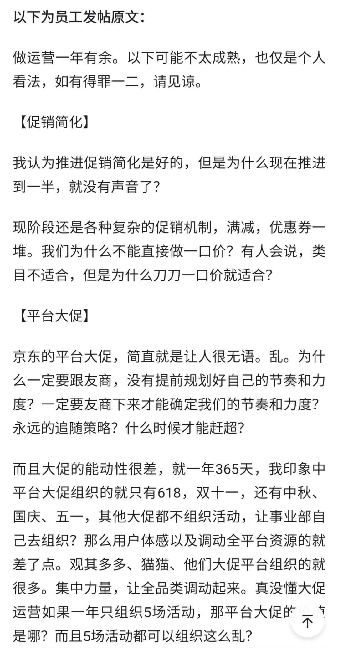 11月29日晚,拼多多市值一度涨至1924亿美元,超过阿里巴巴成了美股市值最大中概股。当时京东的市值为435亿美元,拼多多的市值相当于4个京东。对于京东而言,这可不是江湖地位的虚名,市场被不断蚕食的现状已经将京东推到了风口浪尖,留给京东的时间不多了。这次刘强东在内网的回复,可以说是一次新的表态。从此次回复的内容来看,京东在组织变革方面肯定有了一些思路,改变应该也已经开始了。至于能否重回巅峰,就看这些改变后续的效果了。