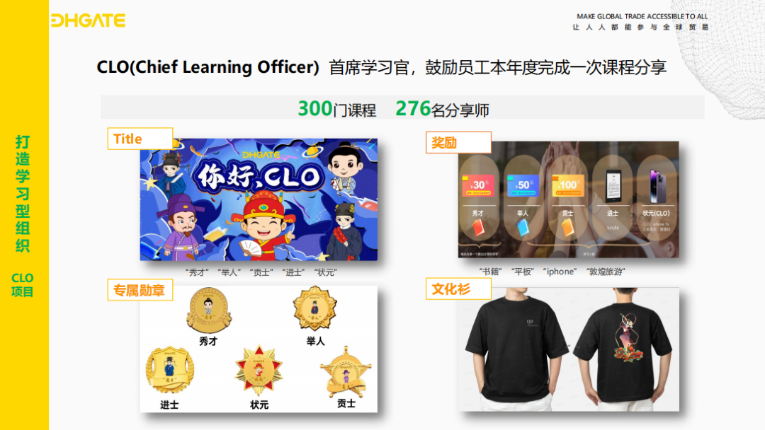为激励员工参与,敦煌网精心设计了一系列有趣的称号,如“秀才”“举人”“贡士”“进士”,用于表彰每个季度各部门的优胜者。获奖员工还将获得虚拟头像、勋章、文化衫、书籍、pad 等专属奖励。年度最受欢迎的分享者将荣膺clo的殊荣,这一举措不仅极大地激发了员工的学习积极性,还推动了知识的传播和经验的积累。
