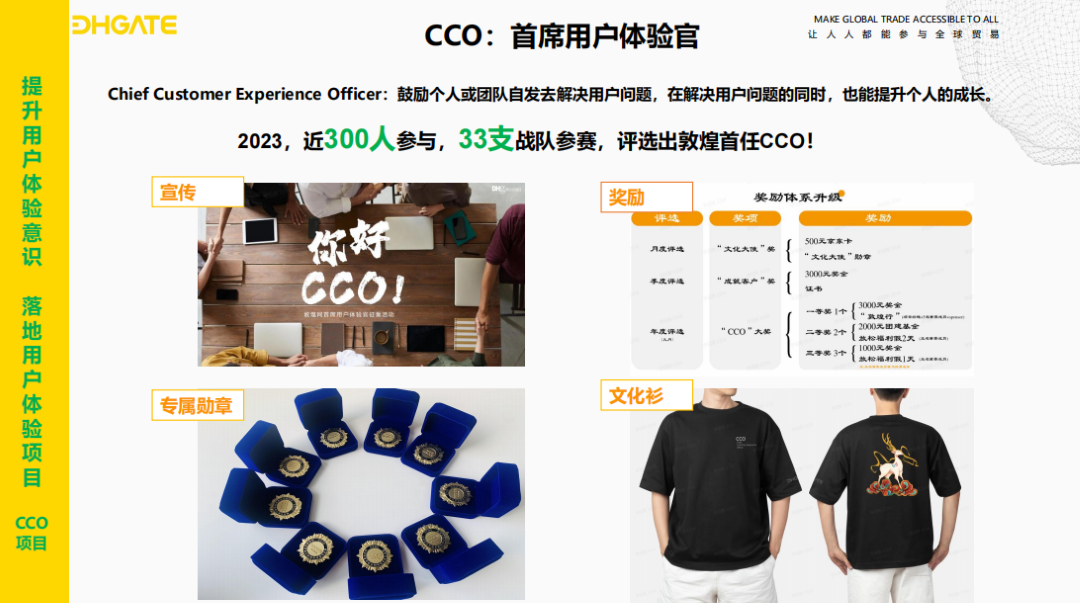 此类项目不但提升了用户的满意度与忠诚度,还锤炼了员工的能力,促进了人才的自我成长和涌现,助力公司发掘出众多富有想法和能力的卓越人才。在2023 年的cco评比中,33支项目小组的300余人参与其中,所解决的问题包含买家/卖家/物流侧的用户体验、pc/app等基础设施体验以及针对公司内部员工流程等体验,最终评选出10支获奖队伍,并确定了公司的首任cco。