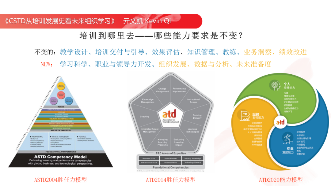 观察atd(人才发展协会)近20年发布的三大能力模型(2004年金字塔模型、2014年钻石模型、2020年能力模型),能清晰看到培训专业的变与不变。贯穿始终的核心能力包括教学设计、培训交付、效果评估、知识管理、业务洞察、绩效改进六大支柱;迭代更新的维度则体现在学习神经科学、组织发展、数据驱动决策等前沿领域。