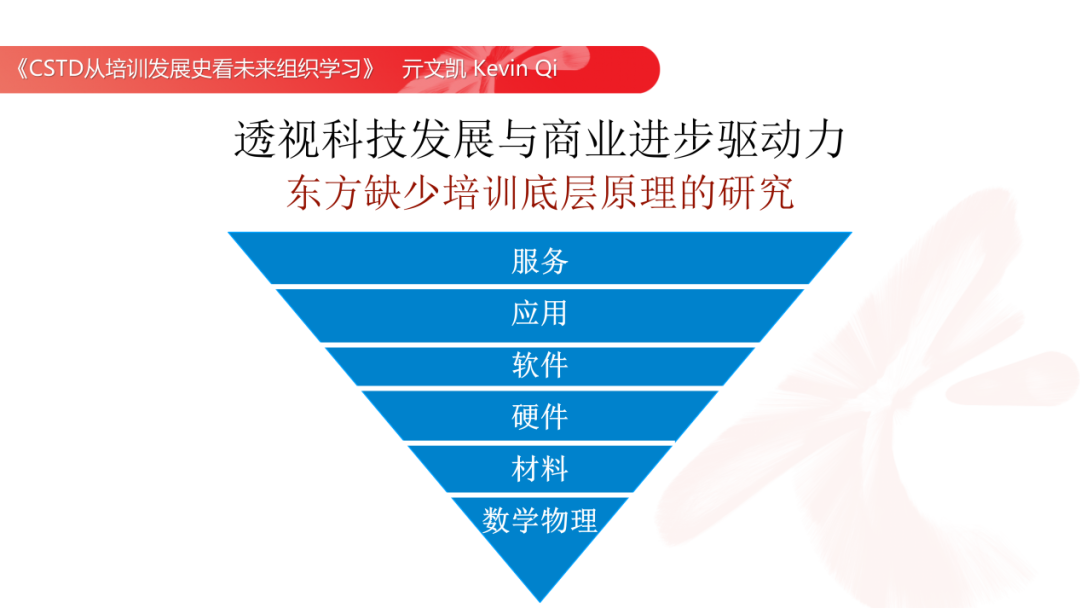 这种历史对照引发关键思考:为何现代培训理论仍由西方主导?继续研究之后,我发现,如果我们要透视一个专业的技术进展,你一定要看它的原始驱动力是什么。比如科技进步是一个倒阶梯模式:基础科学突破(数学物理)→材料革命→硬件迭代→软件升级→应用创新→服务进化。中国培训卡在哪一层了呢?
