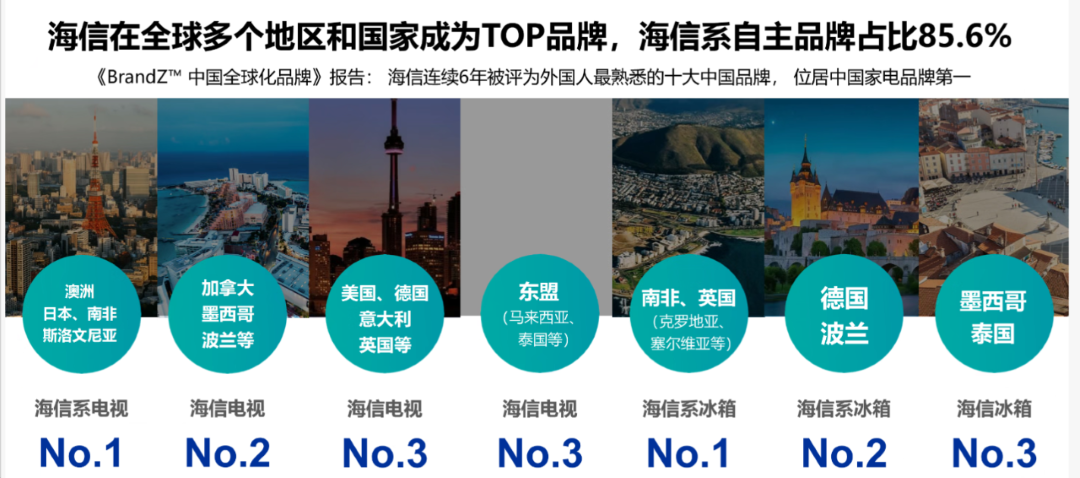 以电视业务为例,海信电视在澳洲、日本等区域市场份额勇夺第一,在斯洛文尼亚、墨西哥等地市场份额位列第二,在德国、英国等欧洲市场跻身前三,展现出强劲的全球竞争力。