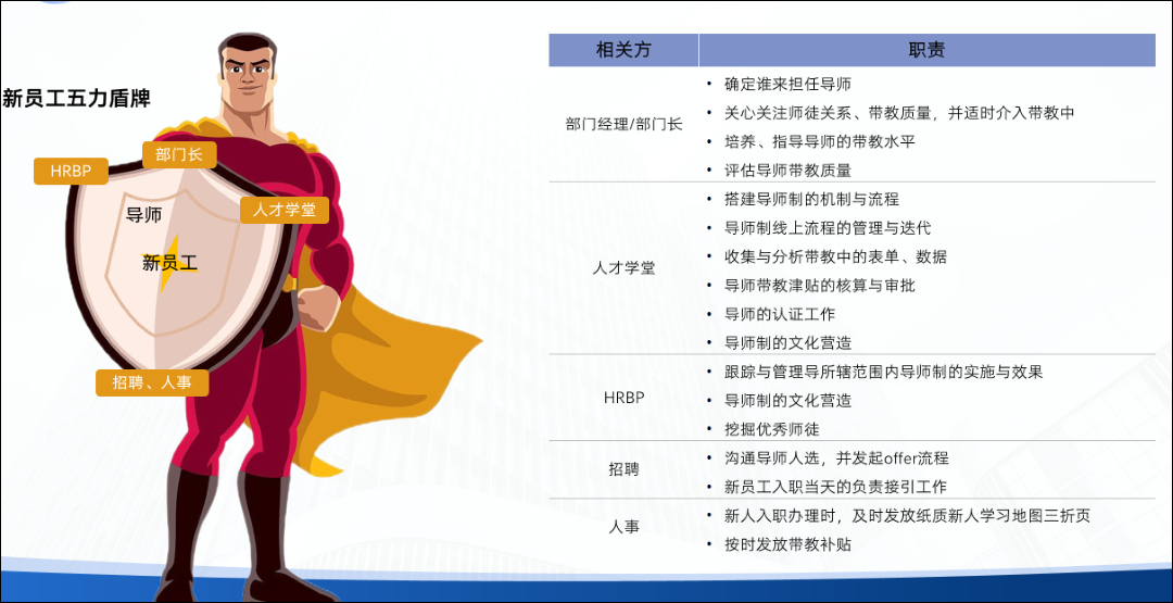 项目以“五力盾牌”为框架,明确了hrbp、部门长、导师、人才学堂与新员工的协同职责,将辅导流程细致地拆解为入职前至转正后的五大阶段。