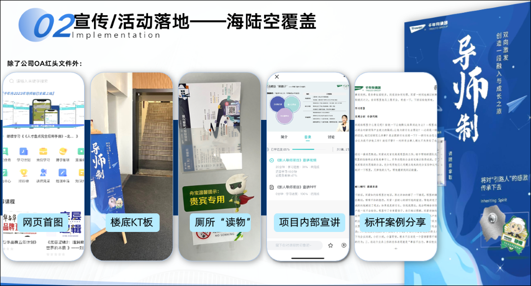 。oa公告、楼层kt板、厕所读物等常态化宣导覆盖日常场景;“拜师仪式”“师徒联谊会”等情感化活动增强参与感;《导师案例集》与《引路人刊》则沉淀优秀实践,推动经验从个人向组织流动。此外,通过周例会、里程碑会议与非正式调研机制,持续收集业务反馈并迭代流程,确保项目与战略需求同步演进。