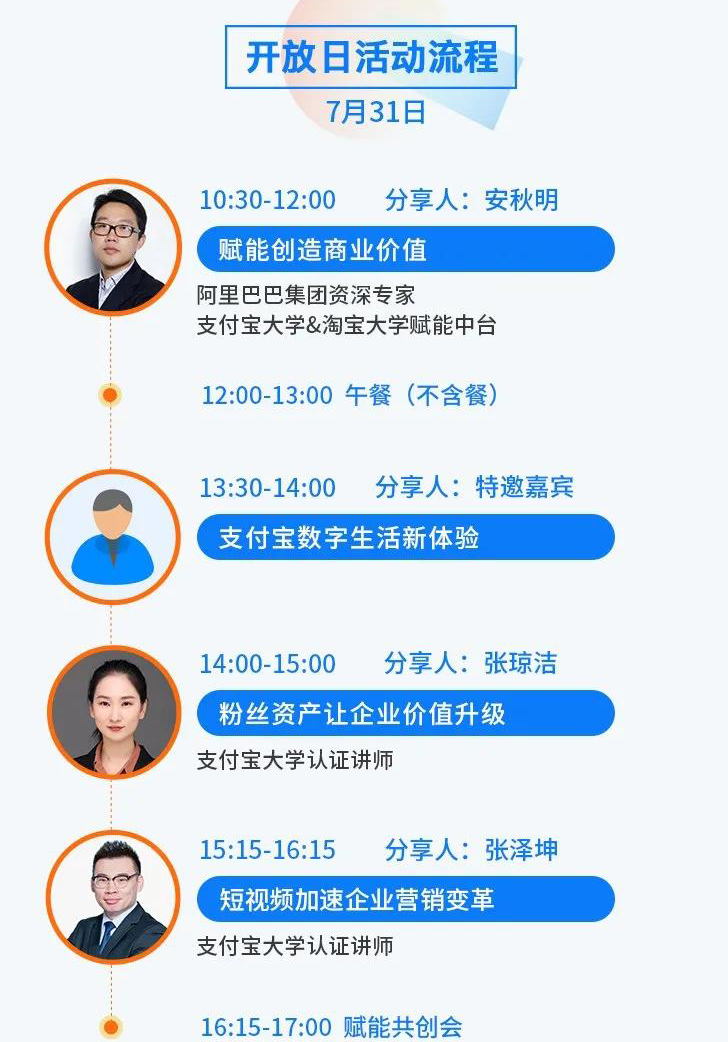 同时,还会设置赋能共创环节,等着大家的思想碰撞。在开放互联的时代,我们相信每一次的相聚,都是一次新的共振的开始。期待在支付宝大学开放日,与大家结网。