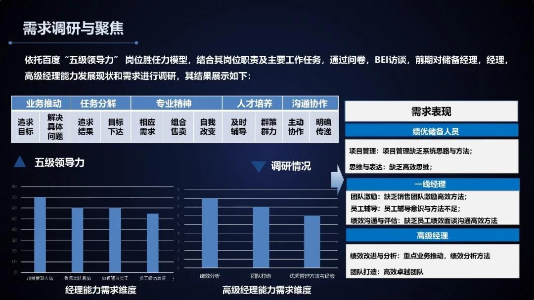 项目思路依托于百度五级领导力模型,包含业务推动、任务分解、人才培养、沟通协作和专业精神、追求极致、主动求变五个层面的内容。百度五级领导力对m1到m5五个层次的人员进行了能力岗位要求和任职资格的说明。项目主要围绕m1进行,他们需要培养提升的是高效执行的能力,即能够关注痛点,带领下属分配任务,解决问题,做好监督与反馈,完成目标。除了依托百度五级领导力,项目还通过问卷、bei访谈的方式对储备经理、经理和高级经理进行需求调研,最后整理出该层级需要重点提升的能力。