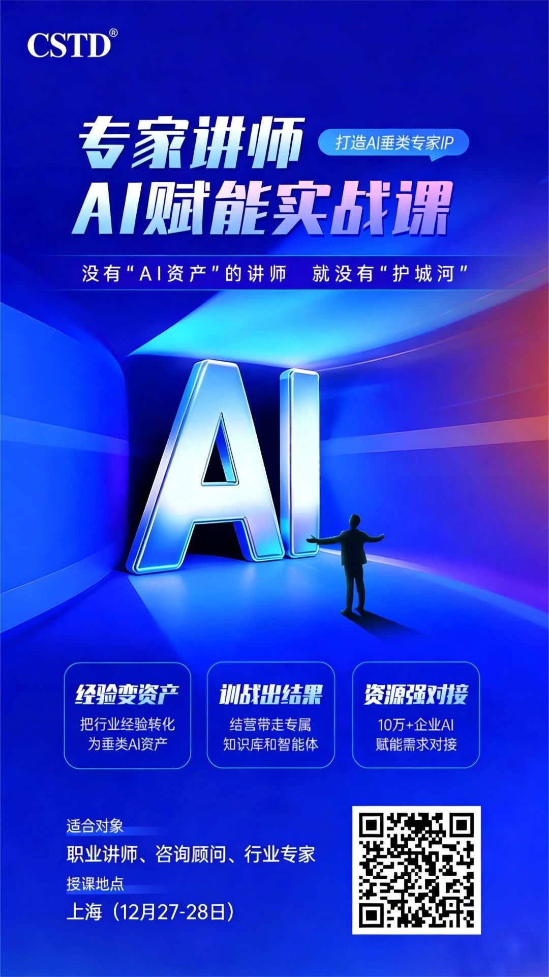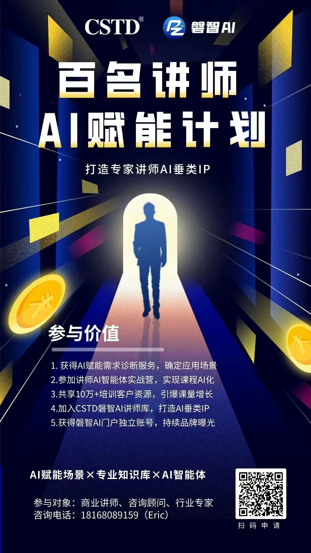 为了帮助商业讲师实现ai转型,cstd隆重推出《专家讲师ai智能体实战课》,通过线上线下的辅导训练,结合磐智ai赋能生态平台,共享10万 企业培训客户资源,助力商业讲师打造垂类ai专家ip,实现领域知识资产的ai商业转化。