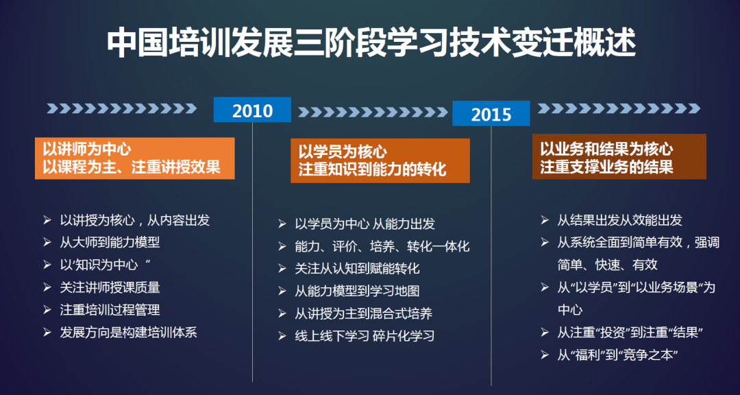 培训从“以知识为核心”进化到了“以能力为核心”,从“以讲师为核心”到“以学员为核心”,新的学习体系构建和技术创新,培训从第一代跨入了第二代,行业也开始把“培训”升级为“学习”。