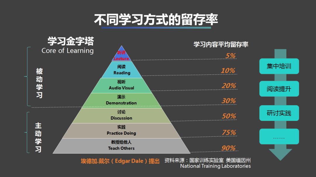 埃德拉.戴尔在美国国家训练实验室研究发现,知识讲授两周之后,学员记忆的留存率仅有5%。学习有效的前提是学员把知识储备在大脑里,在需要时应用。如果短短两周时间,学员就把学到的知识遗忘95%,如同大口径漏斗,真正工作中需要使用的时候,已经没有留存了。