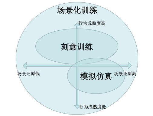 刻意训练也称为场景化行为训练。为实现既定场景结果,针对提炼出的有效行为进行训练。它用两个维度分类场景化训练,一是场景还原度差异,一是因训练次数使行为实现的行为成熟度差异。