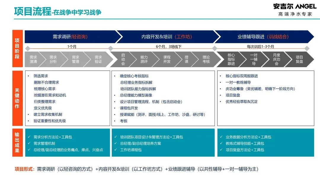 项目在具体实施上,主要分为:需求调研、内容开发&培训、业绩辅导跟进。