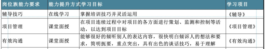 此时,在职位族中的组织能力已进行了一一对应,就可以依据组织能力的拆分,明确应知应会的学习项目。比如说,区域的销售管理,上文中为大家介绍了扩大市场份额所需要的能力,此时,区域销售管理的能力,就落到了区域销售经理这一岗位中。在这个岗位上,区域销售管理又被细分为沟通能力、辅导能力等等。