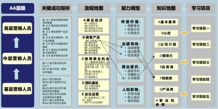 例如,区域销售管理这一组织能力,对其进行分析,就可以先看其组织能力是哪些岗位承接的,进而列出岗位应知应会的能力要求。对应完成后,可以进行细化,将细化的能力转变为学习的项目。
