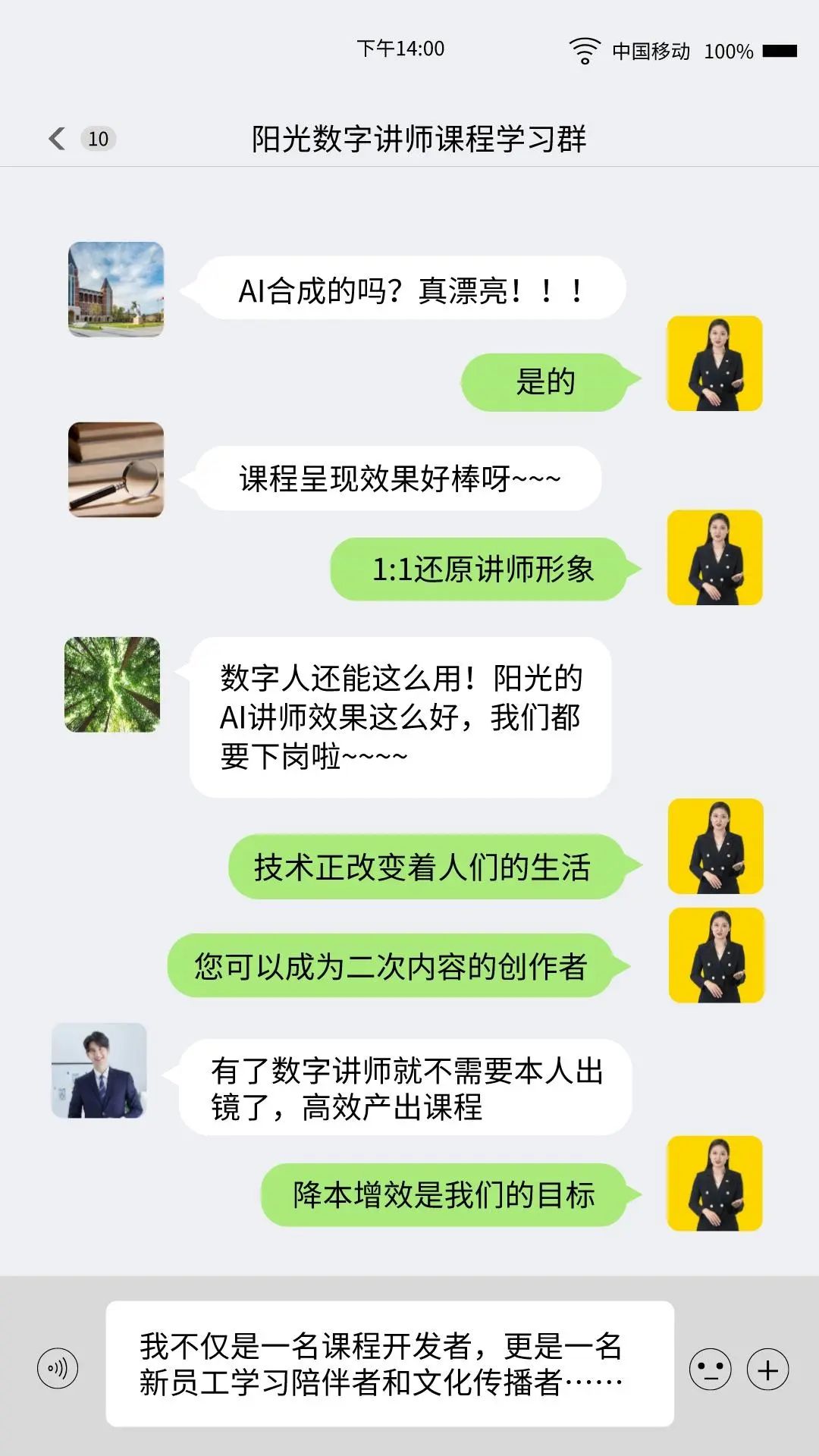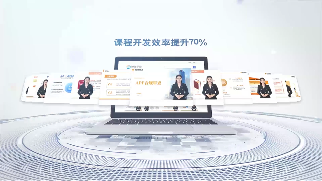 首先,“阳光数字讲师”作为高效的课程开发老师,当外部政策发生变化、公司新产品发布或有优秀经验需要传承时,讲师只需要提供课程基本资料,就可以驱动数字讲师快速生成在线课程,相比传统真人录制,不仅准确率100%,而且整体课程开发效率提升70%。一个多月的时间,阳光大学堂已经帮助各业务条线开发了近百门课程,大家对“阳光数字讲师”的工作给予了满满的好评!